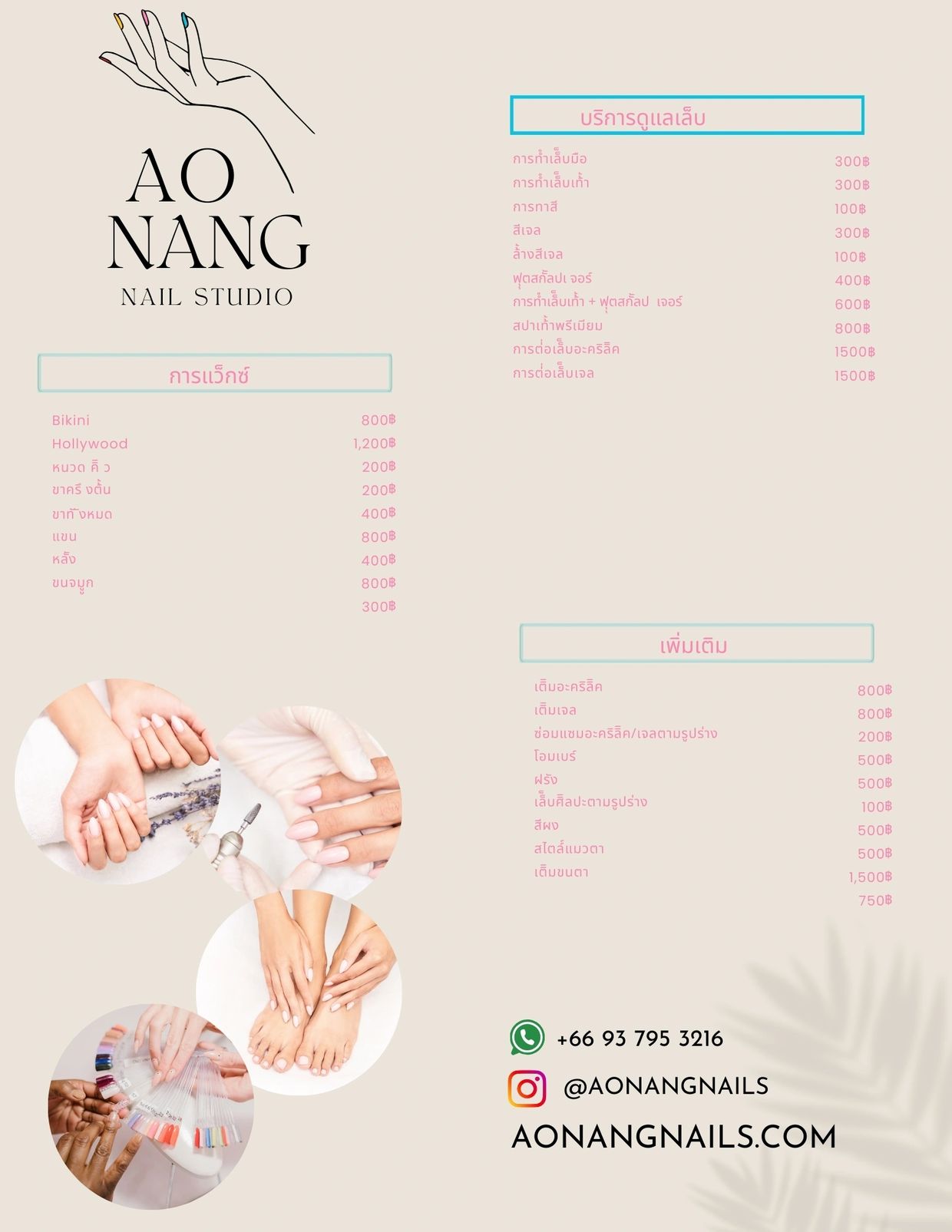 ที่ Ao Nang Nails เรามีการบริการที่หลากหลายและใส่ใจในการดูแลเล็บอย่างละเอียด และประสบการณ์สปาที่อบอุ่น บนเมนูของเราถูกออกแบบมาเพื่อตอบสนองทุกความต้องการของความสวยของคุณ ตั้งแต่การทำเล็บมือและเล็บเท้าอย่างล้ำลึก ไปจนถึงศิลปะการทำเล็บที่สดใสและการทำสปาที่หรูหรา